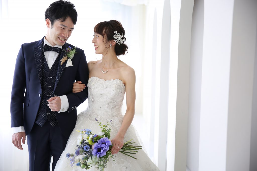 白いウェディングドレスには、青~紺色などの寒色の相性が抜群!